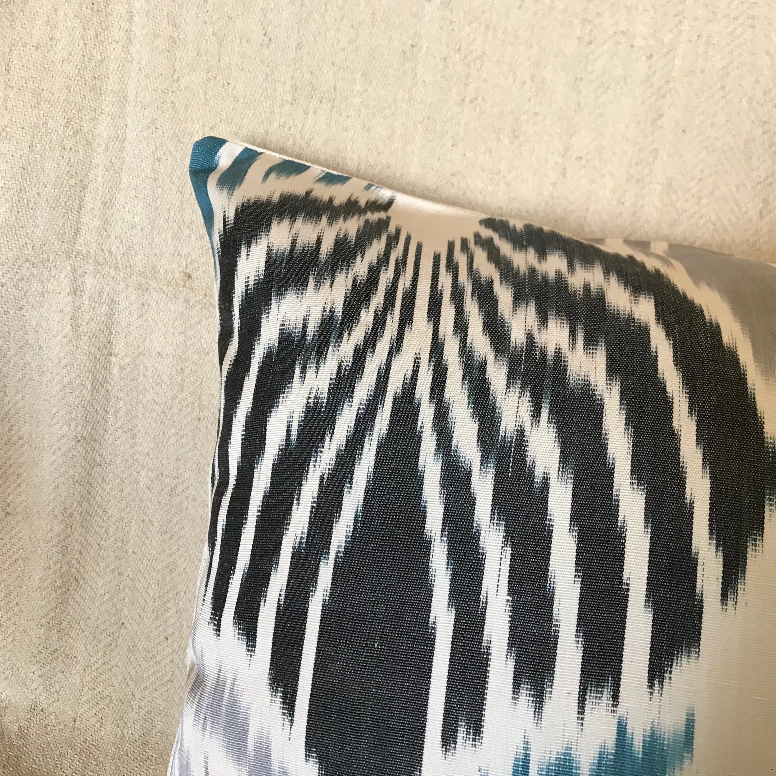 Coussin en soie ikat fabriqué à Istanbul, à partir de bandes de soie artisanale.